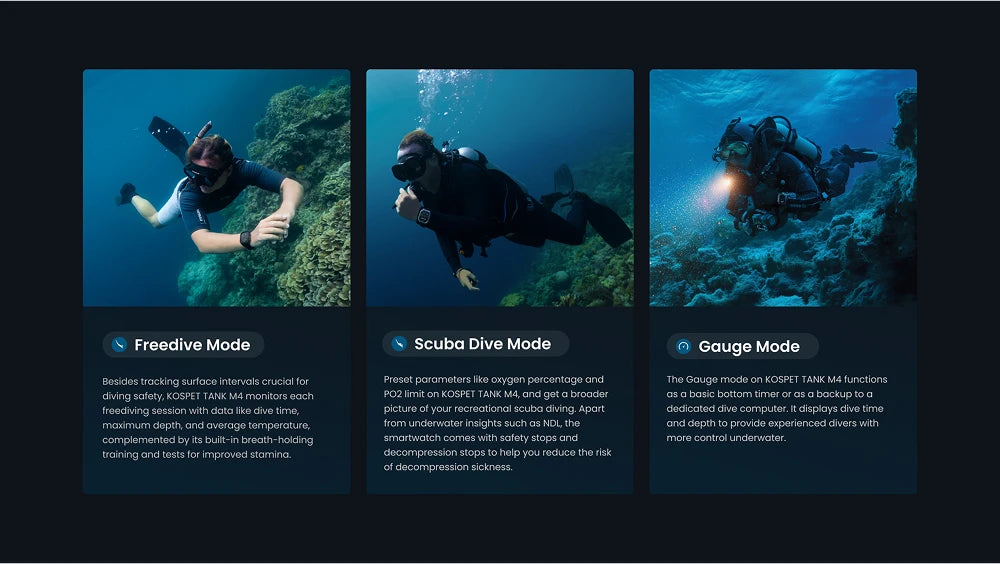Dive Modes Support: 3 (Freedive, Scuba dive, Gauge)